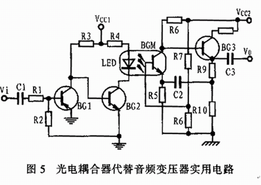 目前,利用光電耦合器代替音頻變壓器的應(yīng)用電路有多種形式,圖5所示是比較實(shí)用的一種。當(dāng)輸入信號Vi經(jīng)三極管BG1、BG2前級放大之后,驅(qū)動光電耦合器左邊的LED發(fā)光,并被右邊的光敏管全部吸收并轉(zhuǎn)換成電信號,此信號經(jīng)后級電路BG3放大,并由該管的發(fā)射極通過電容器C3后輸出一個(gè)不失真的放大信號 V0。由于該電路將前后兩級放大器之間完全隔離,因而杜絕了地環(huán)路可能引起的干擾。同時(shí)由于該電路還具有消噪功能,因此避免了信號的失真。整個(gè)電路的總增益可望達(dá)到20dB以上,帶寬約120kHz。