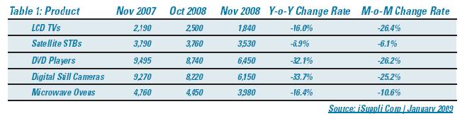 2008年11月,許多主要消費電子產(chǎn)品的出口量環(huán)比和同比雙雙下降,包括液晶電視、衛(wèi)星機頂盒(STB)、DVD機、數(shù)碼相機和微波爐。數(shù)碼相機出口量的同比下降幅度最大,比2007年11月減少33.7%。液晶電視環(huán)比降幅最大,單位出貨量比10月下滑26.4%。