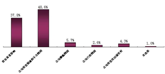 一個(gè)公司能否健康地發(fā)展,領(lǐng)導(dǎo)層的作用至關(guān)重要。常言道,滄海橫流方顯英雄本色,在經(jīng)濟(jì)牛市中,考驗(yàn)的是企業(yè)決策人的遠(yuǎn)見和膽識,在經(jīng)濟(jì)熊市中,就更需要企業(yè)領(lǐng)導(dǎo)層的聰明才智。此次調(diào)查顯示,超過64.3%的電子工程師給了自己的企業(yè)領(lǐng)導(dǎo)層很正面的評價(jià),從這個(gè)結(jié)果來看,我們的電子行業(yè)的工作和諧程度還是較高的!