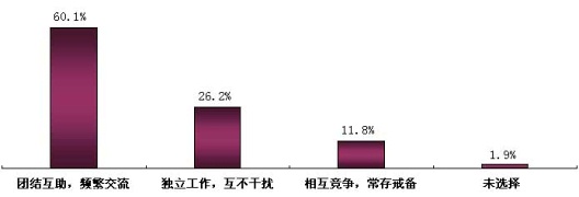 為了更深入了解電子工程師的生存環(huán)境,我們特意設(shè)置了這個(gè)問題。對每一位工程師來說,同事關(guān)系處理的如何,直接影響著他們的工作質(zhì)量和生活質(zhì)量,良好的同事關(guān)系,利人利己,利公利私。特別讓我們欣慰的是,60.1%的電子工程師和同事處于團(tuán)結(jié)互助,頻繁交流的工作狀態(tài),在目前經(jīng)濟(jì)危機(jī)的陰霾籠罩下,這樣同事關(guān)系顯的尤為重要。(見圖表七)