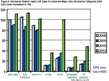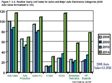 美國汽車生產(chǎn)遠遠落后于銷售,因為在美國銷售的客車有很大一部分是在加拿大、墨西哥、歐洲和亞洲生產(chǎn)的。該圖還顯示汽車音響本體、車載導航、ADAS、嵌入遠程信息通訊和藍牙免提接口(HFI)電子的相對銷售情況。每個類別的銷售情況相近,都是在2009年下降,隨后幾年增長。只有藍牙HFI系統(tǒng)的銷售將在2009年上升,因為Ford Sync和類似系統(tǒng)取得了成功。