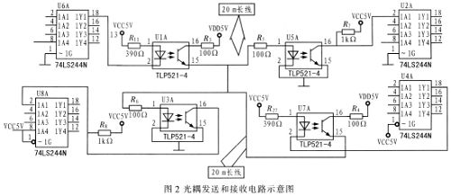 采用光電隔離器TLP521-4對發(fā)送和接收設(shè)備進(jìn)行電氣隔離,對于減小交流阻抗的作用十分明顯,進(jìn)而增大傳輸電流,有效地抑制地線噪聲;同時(shí)由于74LS244N的應(yīng)用??偩€驅(qū)動(dòng)能力得到保障。圖2為光耦發(fā)送和接收電路示意圖。圖2中,上半部兩光耦自左向右傳輸信號(hào),下半部兩光耦自右向左傳輸信號(hào),左端74LS244N通過靜態(tài)存儲(chǔ)器IDT7132與處理器進(jìn)行數(shù)據(jù)交換,右端通過8255與處理器進(jìn)行數(shù)據(jù)交換。