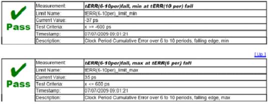 JEDEC標(biāo)準(zhǔn)要求測量n分別為2、3、4、5、6-10、11-15時tERR(n per)的最大及最小值。對于這樣的要求,如果要用手工測量將是非常耗時且低效率的。力科QPHY-DDR2軟件包的時鐘測量部分支持上述所有參數(shù)的自動測量,僅需使用一根差分探頭將時鐘信號接入示波器即可完成所有的測量工作,測量后的所有參數(shù)結(jié)果及對應(yīng)波形將列在自動生成的測試報告中并與JEDEC標(biāo)準(zhǔn)中門限值進(jìn)行比較。如下圖為使用QPHY-DDR2測量tERR(6-10 per)時的部分結(jié)果與對應(yīng)波形。