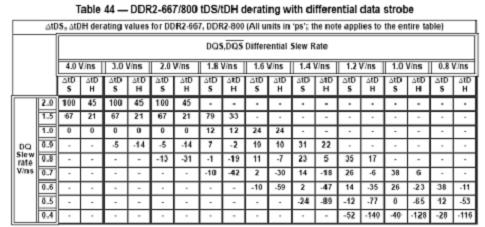 時序測試部分主要對DDR2數(shù)據(jù)、時鐘及控制線上各種時序進(jìn)行測量,包括數(shù)據(jù)輸入建立/保持時間、數(shù)據(jù)輸出保持時間、數(shù)據(jù)讀/寫時DQS前導(dǎo)/后續(xù)時間、時鐘半周期寬度、DQS輸入高/低脈沖寬度等等二十余項參數(shù)。其中,在對數(shù)據(jù)輸入建立/保持時間(tDS、tDH)進(jìn)行測量時,JEDEC標(biāo)準(zhǔn)規(guī)定需要根據(jù)寫數(shù)據(jù)時的DQ及DQS信號斜率對測得的建立保持時間進(jìn)行修正。下表為JEDEC標(biāo)準(zhǔn)中對應(yīng)DDR2 667/800的輸入建立/保持時間修正參數(shù)表。例如,寫操作時當(dāng)DQ測得的斜率為1.5V/ns,DQS斜率為3.0V/ns時,測得的DQ – DQS建立/保持時間需要加上67ps的修正值之后方能與標(biāo)準(zhǔn)中規(guī)定的最小建立/保持時間相比較。