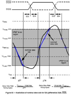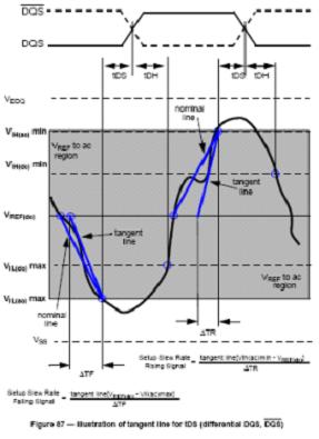 為了在上表中查到對應(yīng)的修正值,需要首先得出相應(yīng)信號的斜率。JEDEC標(biāo)準(zhǔn)規(guī)定了兩種斜率計算方法,即直連斜率norminal slew rate和切線斜率tangent slew rate,分別在不同數(shù)據(jù)波形時采納。兩種斜率計算方法如下圖所示。