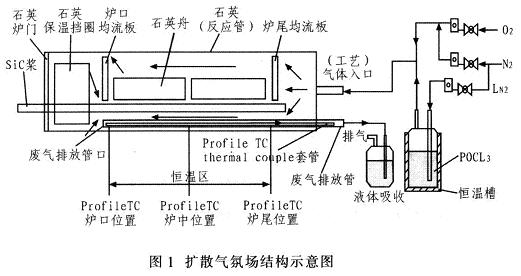 針對管式擴散爐的特點,優(yōu)化擴散的均勻性主要采取溫區(qū)補償技術。在大規(guī)模生產中,補償方法主要通過調整工藝反應時間、氣體流量和反應溫度三者實現(xiàn)。配備懸臂裝載機構擴散爐本身的特點及恒溫區(qū)位置的固定,確保了SiC槳、石英保溫檔圈、均流板和石英舟是固定位置使用。影響擴散均勻性因素除相關物件固定放置位置外,工藝氣體總流量、廢氣排放流量與爐內壓強的平衡設置,均流板的氣體均勻分流設計,廢氣排放位置與氣流變化對溫度穩(wěn)定抗干擾的平衡設置等因素也至關重要,因這些因素相互關聯(lián)影響,使得生產中的工藝優(yōu)化相對困難,尤其是氣氛場因素更難控制,這也是該研究領域至今未建立擴散均勻性氣氛場工程模型的難點。