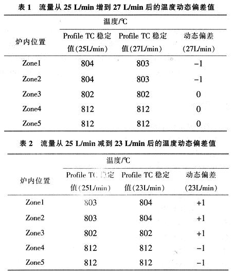 (4)手動調節(jié)大N2流量,從25L/min,減少到23L/min,記錄流量調節(jié)前后穩(wěn)定溫度值和流量變化導致的溫度動態(tài)偏差值,見表2,表中Zone1為爐尾,Zone2是爐中尾,Zone3為爐中,Zone4是爐中口,Zone5為爐口。