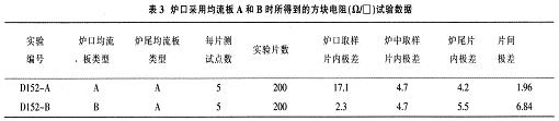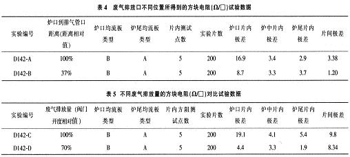 從表4可看出,廢氣排放口離恒溫區(qū)越遠,即離爐口越近,爐口的方阻片內/片間均勻性改善越好,但廢氣排放的同時也有大量熱能的排放,在排放口區(qū)域聚集的熱能較多,因考慮到爐門的低溫(一般為小于200℃)要求,在一定程度上又限制了排放口到爐門的距離不能太近。所以,生產中廢氣排放口的較佳位置是在一個兩向平衡距離范圍內。