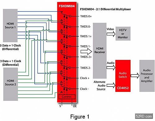 以FSHDMI04 這類HDMI開關為例,只需簡單地插入到選定的HDMI接收器和兩個HDMI連接器之間即可。若針對一個完整的解決方案,還需要切換較高電壓及較低頻率的控制信號,建議使用一個至少165MHz的簡單5V 方型 SPDT開關,例如FSAL200 或 FSAV330。這些控制信號用于接收器(Sink) 和資料源(Source) 之間的首次交換,而資料源以此來決定接收器能夠處理什麼樣的視頻解析度,只需要FSHMDI04加上第二個用于控制資料的開關,即可在單輸入設計上完全實現(xiàn)第二個HDMI輸入埠。
