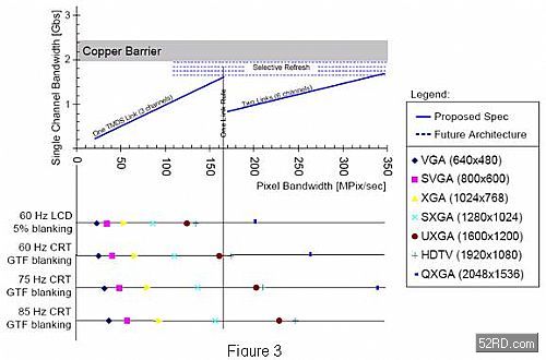 DVI是市場上第一個標準化的純數(shù)字視頻連接。與HDMI一樣,它對單或雙鏈路配置的需求取決于所選的顯示器解析度,以及顯示器類型和相應的更新頻率。DVI端子在電腦應用中仍然相當普及,許多系統(tǒng)都具有DVI輸出以便實現(xiàn)至數(shù)字LCD 顯示器的直接數(shù)位連接。舉例說,一個更新頻率為60Hz的高解析度 LCD顯示器(1920x1080)可利用單鏈路DVI和約130MHz的時脈頻率連接。這可參考圖3 的DVI規(guī)格參考。