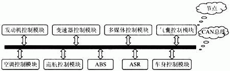 現(xiàn)代汽車典刑的控制單元有發(fā)動(dòng)機(jī)控制模塊、變速器控制模塊、多媒體控制模塊、氣囊控制模塊、空調(diào)控制模塊、巡航控制模塊、車身控制模塊(包括照明指示和車窗、刮雨器等)、防抱死制動(dòng)系統(tǒng)(ABS)防滑控制系統(tǒng)(ASR)等。完善的汽車CAN總線網(wǎng)絡(luò)系統(tǒng)架構(gòu)如圖1所示。