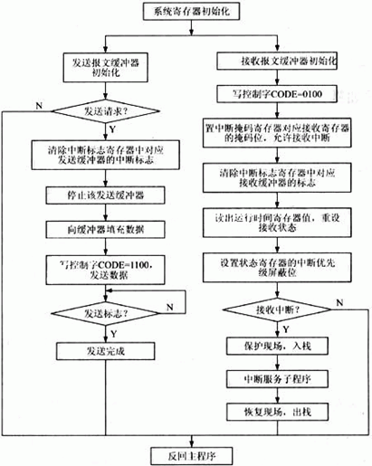 各控制器應(yīng)按規(guī)定格式和周期發(fā)送數(shù)據(jù)到總線上,同時(shí)也要接受其他控制器的信息??偩€上的其他控制器則根據(jù)需要各取所需的報(bào)文。對(duì)于接收數(shù)據(jù),本系統(tǒng)采用中斷方式實(shí)現(xiàn)。一旦中斷發(fā)生,即將接收的數(shù)據(jù)自動(dòng)裝載到相應(yīng)的報(bào)文寄存器中,此時(shí)還可采用屏蔽濾波方式,利用屏蔽濾波寄存器對(duì)接收?qǐng)?bào)文的標(biāo)識(shí)符和預(yù)先在接收緩沖器初始化時(shí)設(shè)定的標(biāo)識(shí)符進(jìn)行有選擇地逐位比較,只有標(biāo)識(shí)符匹配的報(bào)文才能進(jìn)入接收緩沖器,那些不符合要求的報(bào)文則將被屏蔽于接收緩沖器之外,從而減輕CPU處理報(bào)文的負(fù)擔(dān)。此外,不同數(shù)據(jù)應(yīng)放入不同的報(bào)文寄存器中,因此在接收中斷服務(wù)程序中,就可以容易地判斷出中斷是由哪個(gè)接收?qǐng)?bào)文引起的,其程序流程圖如圖3所示。