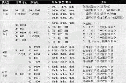 本協(xié)議遵循CAN2.0B規(guī)范,根據(jù)車身控制模塊的特點(diǎn),采用源→目的方法,每個(gè)節(jié)點(diǎn)都有自己固定的標(biāo)識(shí)地址,且節(jié)點(diǎn)數(shù)小于64,設(shè)計(jì)時(shí)可將中央控制模塊設(shè)為主節(jié)點(diǎn),而將車門、電動(dòng)座椅子模塊及自檢子模塊設(shè)置為從節(jié)點(diǎn)。本協(xié)議可完成以下功能:
