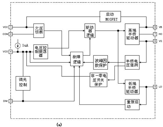 IRS2530D和IRS2158D為600V控制IC。IRS2530DDIM8是一種采用緊湊型8管腳尺寸半橋式驅(qū)動器的線性調(diào)光鎮(zhèn)流器控制IC。它只需要幾個小型外部元件,顯著地簡化和縮小了電路設(shè)計(jì),同時可實(shí)現(xiàn)10%的調(diào)光系統(tǒng)性能。圖3(a)為引腳功能示意圖。[page]