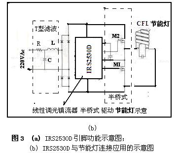 從圖3(a)可知,IRS2530D為8引腳控制IC,采用IR的專利鎮(zhèn)流器和高壓技術(shù)。一個高壓管腳可檢測半橋電流和電壓,以實(shí)現(xiàn)必要的鎮(zhèn)流器保護(hù)功能;DC調(diào)光輸入電壓基準(zhǔn)與AC燈電流反饋相結(jié)合,可以實(shí)現(xiàn)單管腳調(diào)光;IRS2530D還具有內(nèi)部非零電壓切換保護(hù)和內(nèi)部振幅因數(shù)保護(hù),防止燈泡故障損壞鎮(zhèn)流器。圖3(b)為IRS2530D與節(jié)能燈連接應(yīng)用的示意圖。
