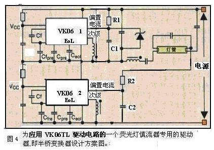 圖4為應(yīng)用VK06TL驅(qū)動電路的一個熒光燈慎流器專用的驅(qū)動器,即半橋變換器設(shè)計(jì)方案圖。
