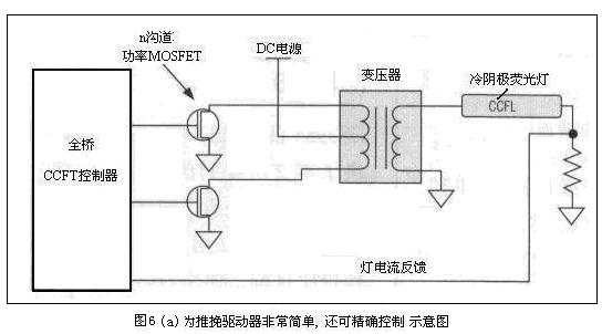 之所以考慮推挽驅(qū)動器,因它有很多好處。這種架構(gòu)只用到n溝道MOSFET(見圖6(a)所示),這有利于降低成本和增加逆變器效率。它很容易適應(yīng)較高的逆變器直流電源電壓。采用更高的逆變器直流電源電壓時,只需選擇具有合適的漏-源擊穿電壓的MOSFET即可。不管逆變器的直流電源電壓如何,都可采用同樣的CCFL控制器。但采用n溝道MOSFET的全橋和半橋架構(gòu)就無法做到這一點(diǎn)。對于LCD電視非常理想,因?yàn)殡娨曋械哪孀兤髦绷麟娫措妷和ǔ环€(wěn)定在±20%。