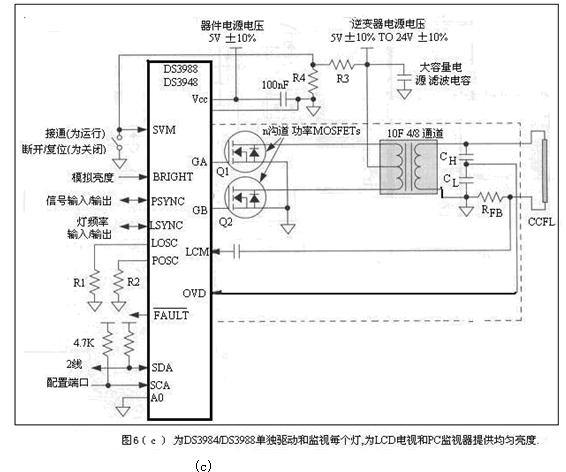 圖6(c)為用DS3984(4通道)和DS3988(8通道)CCFL控制器既解決了本文所提到的所有這些設(shè)計(jì)挑戰(zhàn)??蓪⑦@些器件配置為每個通道驅(qū)動一個燈,或者每通道多個燈,用戶可靈活裁減設(shè)計(jì),以滿足自己的性價比目標(biāo)。多個DS3984/DS3988可輕松級聯(lián),以支持任意數(shù)量的燈,來為LCD電視屏提供背光照明。