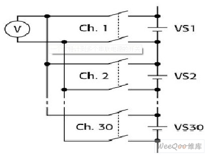 圖1給出了切換伏特計到多個串聯(lián)的30電壓源(VS)的情形。為了避免其中一個或多個發(fā)生短路,必須在關(guān)閉一個通道之前打開另一個通道(操作前斷開)。此外,要給每個電壓源串聯(lián)熔絲,避免超過卡的共模額定電壓。在這個例子中,每個電源都是12V,整個串聯(lián)電源的總電壓為360V。最好采用至少500V的通道-通道額定電壓和共模額定電壓。