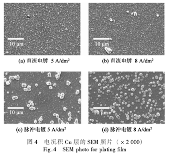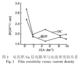 圖1是電沉積Cu層電阻率與電流密度之間的關(guān)系??梢?,脈沖電鍍得到的Cu鍍層電阻率小于相同電流密度下的直流鍍層。在小電流密度時(<2A/dm2),直流鍍層和脈沖鍍層的電阻率都較大。