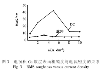 圖3為脈沖電鍍與直流電鍍電沉積Cu鍍層表面粗糙度RMS(rootmeansquare)與電流密度的關(guān)系??梢娒}沖所得鍍層表面粗糙度僅為幾個納米,而直流所得鍍層表面粗糙度在10nm以上,最大時甚至達到了40nm,這樣大的粗糙度將為后續(xù)CMP工藝造成極大的困難。而平整的表面可以為CMP工藝提供一個易于進行處理的基底表面,采用脈沖電鍍Cu鍍層的表面粗糙度RMS比直流電鍍的低。