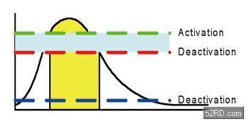 電容式感測器利用基線值和一連串的臨界值來決定感測器的觸發(fā)狀態(tài)。觸發(fā)區(qū)域的上下限能對感測器的觸發(fā)產(chǎn)生遲滯作用。要觸發(fā)感測器就必須要超越較高的臨界值,而且被觸發(fā)的狀態(tài)會一直持續(xù)到計數(shù)值降到較低的臨界值以下為止,如(圖四)。