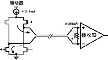 一個簡單的LVDS傳輸系統(tǒng)由一個驅動器和一個接收器通過一段差分阻抗為100Ω的導體連接而成,如圖1所示。驅動器的電流源(通常為3.5mA)來驅動差分線對,由于接收器的直流輸入阻抗很高,驅動器電流大部分直接流過100Ω的終端電阻,從而在接收器輸入端產(chǎn)生的信號幅度大約350mV。通過驅動器的開關,改變直接流過電阻的電流的有無,從而產(chǎn)生“1”和“0”的邏輯狀態(tài)。在有些最新生產(chǎn)的LVDS接收器中,100Ω左右的電阻直接集成在片內輸入端上了,如MAXIM公司的MAX9121/9122等。