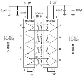 圖2是采用MAXIM公司的一片MAX9123驅動器和一片MAX9122接收器設計的一個4通道LVDS點對點連接的單工接口。該接口工作電源為+3.3V,驅動器輸入和接收器輸出數(shù)據(jù)為LVTTL/LVCMOS電平。