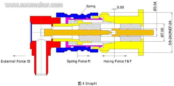 但跟傳統(tǒng)的螺紋連接的N 相比,SnapN 還是有局限性。我們知道 SnapN 外導(dǎo)體端面之間的接觸壓力由其彈簧A 提供--ROSERBERGER 提供的數(shù)據(jù)是30N,根據(jù)力的相互作用原理,我們可以知道接頭的結(jié)合力也是30N。在某些應(yīng)用場合,由于粗重電纜的擺動(dòng),傳導(dǎo)到接頭的作用力很容易超30N,一旦超過這個(gè)臨界力,外導(dǎo)體端面之間會(huì)發(fā)生瞬時(shí)分離,而影響信號(hào)傳輸。那是否能提高這個(gè)臨界力呢?我們知道,彈簧A 對(duì)外導(dǎo)體端面提供的接觸壓力與接頭的結(jié)合力是等量的,如果我們?cè)黾訌椈勺饔昧?--比如增加到100N,那意味著接頭結(jié)合力也達(dá)到100N,顯然,匹配一對(duì)接頭需要用100N 的力氣是讓人無法接受的。