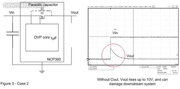 在圖3的案例2中,輸出電容已被移除。這樣,當(dāng)OVP器件輸入端出現(xiàn)快速輸入瞬態(tài)現(xiàn)象時,旁路元件將保持開路。這時可以在輸出端觀察到過沖,這個過沖可能會損壞連接至OVP輸出端的電子元器件。為了解決這個問題,必須在輸出引腳上連接一個輸出電容,并盡量靠近OVP 器件擺放。