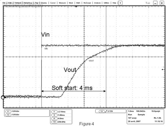 即便出現(xiàn)Vusb或墻適配器快速輸出上升(熱插),在器件的Vout端也觀察不到電壓尖峰,這得益于4ms的軟啟動控制。這種保護(hù)的最關(guān)鍵特性是能以最快速度檢測到任何過壓情況,然后將內(nèi)部FET開路。