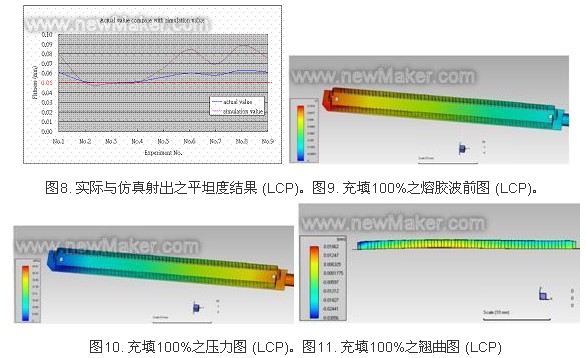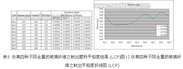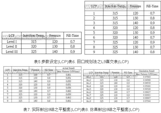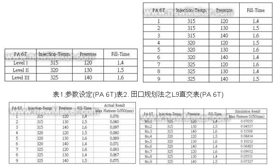[page]塑料射料LCP在已設(shè)定射出溫度、射出壓力、充填時(shí)間之條件參數(shù)后,再設(shè)定仿真之各參數(shù),如表5所示。透過田口方法實(shí)驗(yàn)規(guī)劃,可得L9直交表,如表6所 示。依據(jù)L9直交表,可清楚得知有9組田口規(guī)劃之實(shí)驗(yàn)參數(shù),再分別針對這9組參數(shù),實(shí)際作射出成形,并量測實(shí)際翹曲度,量測之結(jié)果,大部份數(shù)據(jù)皆不符合塑 料翹曲度(Flatness) 0.05mm規(guī)格內(nèi),如表7所示。仿真之最佳化參數(shù)為第三組,其參數(shù)為射出溫度315℃、射出壓力 140 MPa 、充填時(shí)間0.9 s,如圖3所示。