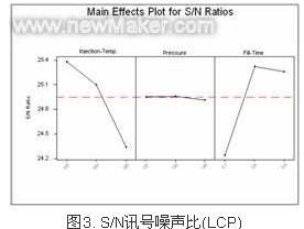 由實(shí)驗(yàn)數(shù)據(jù)輸入田口法計(jì)算機(jī)程序后,經(jīng)因子變動(dòng)計(jì)算,可得S/N(訊號(hào)/噪聲比),如圖2所示。由S/N得到最佳化參數(shù)為,射出溫度315℃、射出壓力 130 MPa、充填時(shí)間1.5 s。此最佳化參數(shù)出現(xiàn)于田口規(guī)劃法L9直交表內(nèi)之第二組實(shí)際數(shù)據(jù),而且實(shí)際射出與仿真射出所得之?dāng)?shù)據(jù)也都是第二組為最佳的,由此可得知PA 6T田口法最佳化組合與實(shí)際射出與仿真射出是互相對應(yīng)的,符合理論與實(shí)務(wù)相互映證,最佳化成形之塑料其平坦度為0.04mm,符合平坦度不超過 0.05mm之目標(biāo)值。