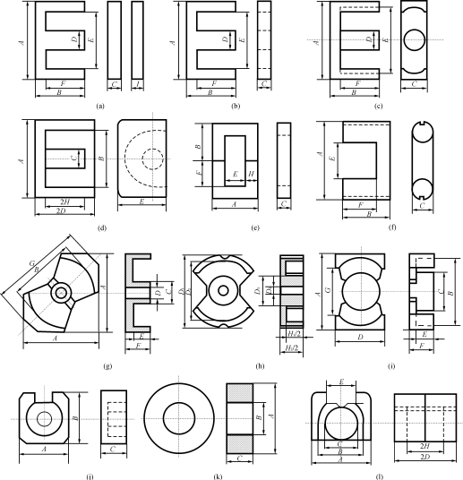 軟磁鐵氧體的鐵心結(jié)構(gòu)比較多,這是由于采用熱壓工藝,比較容易加工成各種形狀。有EI、EE、EER、EP、UF、UYF、RM、PM、PQ、Q(罐形)、T(環(huán)形)和LP形等等(圖8)。EI形以尺寸A(E形鐵心寬度)為標志,EE形以尺寸A(E形鐵心寬度)和2×B(E形鐵心長度)為標志,已形成EI10~50,EE8.3/8.0~110/80系列,品種多,制造工藝簡單成熟,散熱好,便于引出接線,成本較低。缺點是鐵心中間柱截面為方形,給線圈繞制帶來麻煩。同時,無屏蔽,容易產(chǎn)生雜散磁場干擾。EER形也是以尺寸A(E形鐵心寬度)和2×B(E形鐵心長度)為標志,已形成EER25/33~54/50系列,鐵心中間柱截面為圓形,繞線比較方便,同時繞線長度比方形截面縮短11%,從而降低銅損。