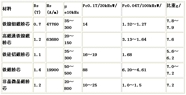 對磁粉芯提出的指標有飽和磁通密度Bs、有效磁導(dǎo)率μe、有效品質(zhì)因數(shù)Qe、有效磁導(dǎo)率溫度系αμe及居里點、比重等。主要的磁粉芯的性能參數(shù)如表1所示。鐵鎳鉬磁粉芯國家標準型號為FN81,上海鋼鐵研究所型號為SN,美國阿諾德公司型號為MPP,磁導(dǎo)率高,工作環(huán)境適應(yīng)范圍廣,損耗低,但價格貴。鐵鎳高磁通磁粉芯國家標準型號為FN50,美國阿諾德公司型號為HF,飽和磁通密度高,磁導(dǎo)率中等,損耗也較低,價格較便宜,國內(nèi)外最近比較重視研究和使用。鐵硅鋁磁粉芯上海鋼鐵研究所型號為SA,美國阿諾德公司型號為MS,是一種價格較低,綜合性能指標較好的磁粉芯。鐵磁粉芯上海鋼鐵研究所型號SF,國外一般型號為IP,磁導(dǎo)率和飽和磁通密度高,但在高頻下?lián)p耗大,只適用于低頻和20kHz以下的中頻使用。由于價格便宜,可以把它加工成大型磁粉芯,代替硅鋼,作為大容量直流電源的濾波電抗器。