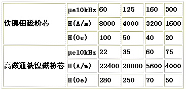 表2鐵鎳鉬磁粉芯和高磁通鐵鎳磁粉芯恒磁范圍