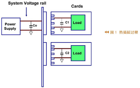圖1所示為熱插拔過程,其中左邊代表系統(tǒng)及其供電,在供電的輸出端有一個(gè)電容,右側(cè)有兩張卡,這些卡的輸入端也有電容。把卡插入系統(tǒng)之前,輸入電容沒有被充電;當(dāng)把卡插入系統(tǒng)時(shí)會(huì)有一個(gè)很大的瞬間電流向輸入電容充電,這么大的瞬時(shí)電流很可能造成系統(tǒng)供電電壓不正常。