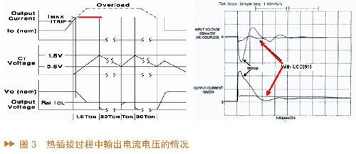 接下來以UCC3915為例說明熱插拔過程中輸出電流電壓的情況。圖3中,左邊圖形是UCC3915的輸出電流、輸出電壓、即時(shí)電容電壓的波形,可以看到當(dāng)輸出電流上升到ITRIP時(shí),計(jì)時(shí)電容開始充電,電壓上升,開始計(jì)時(shí);如果輸出電流超過ITRIP并一直上升到IMAX(設(shè)定的最大值),由于此時(shí)MOS管工作在線性模式,將最大輸出電流限制在這一水平而不讓輸出電流上升,因此輸出電流就會(huì)被限制在IMAX。