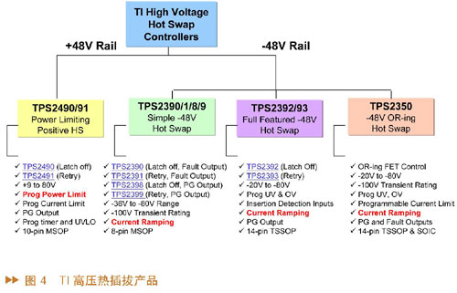 對于高壓熱插拔產(chǎn)品,又可以分為兩類:+48V產(chǎn)品和?48V產(chǎn)品,如圖4所示。48V的產(chǎn)品有TPS2490和2491,這個(gè)產(chǎn)品的工作電壓從9V到80V,含有一個(gè)獨(dú)特的功能叫做定功率的設(shè)定。?48V的熱插拔控制芯片,包括TPS2390、2391、2398和99,這個(gè)系列針對簡單的熱插拔的應(yīng)用,工作電壓從?36到?80V,是8只腳的封裝。第二個(gè)48V的熱插拔是TPS2392和TPS2393,是屬于全功能?48V的熱插拔產(chǎn)品,除了擁有TPS2390系列的所有功能之外,也含有欠壓和過壓的設(shè)定,提供兩只腳做連接器的檢測。