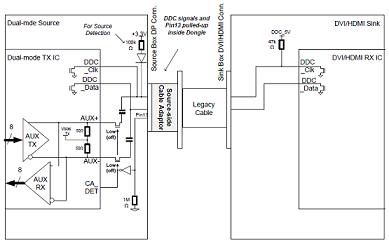 由于在DisplayPort推出之際,HDMI和DVI已經(jīng)存在,所以DisplayPort源設(shè)備必須與現(xiàn)有的HDMI和DVISink設(shè)備能夠互操作。為滿足這個(gè)要求,實(shí)際上所有的DisplayPort數(shù)據(jù)源設(shè)備都是“雙模”設(shè)備,即同時(shí)支持DisplayPort(直接連接),并通過(guò)一個(gè)便宜的線纜適配器(“dongle”)來(lái)支持DVI/HDMI。