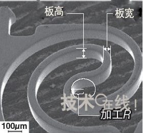 采用電鑄可以形成如圖2的微細(xì)形狀。除了可以將部件的板寬降至板厚的1/3以外,還可以將加工R減至0.04mm。同時(shí),每個(gè)表面都很光滑。