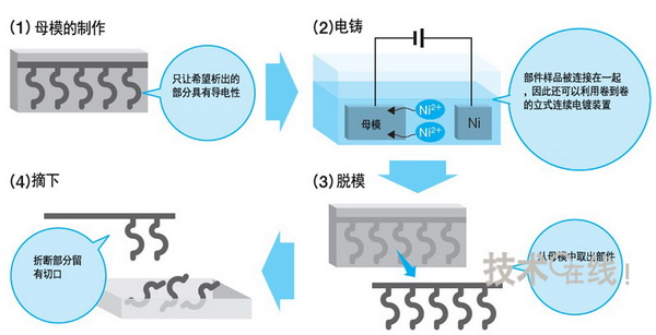 此外,電鑄在生產(chǎn)上也具有優(yōu)勢(shì)。沖壓加工需要昂貴且生產(chǎn)周期較長(zhǎng)的模具,而電鑄則不需要。歐姆龍表示,“采用沖壓加工的話,模具制作需要一個(gè)月左右的時(shí)間。而電鑄只需約一周時(shí)間就可以進(jìn)入量產(chǎn)”。不過,由于電鑄并不是一項(xiàng)新技術(shù),因此其他公司很容易效仿。關(guān)于這一點(diǎn),歐姆龍表示“即使生產(chǎn)出試制品,也不容易進(jìn)行量產(chǎn)”。歐姆龍沒有公布具體的量產(chǎn)方式,不過根據(jù)部件樣品構(gòu)想的大致生產(chǎn)流程如圖3所示。(記者:池松 由香)