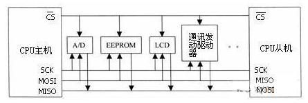 SPI(serial peripheral interface,串行外圍設(shè)備接口)總線技術(shù)是Motorola公司推出的一種同步串行接口。它用于CPU與各種外圍器件進(jìn)行全雙工、同步串行通訊。它只需四條線就可以完成MCU與各種外圍器件的通訊,這四條線是:串行時(shí)鐘線(CSK)、主機(jī)輸入/從機(jī)輸出數(shù)據(jù)線(MISO)、主機(jī)輸出/從機(jī)輸入數(shù)據(jù)線(MOSI)、低電平有效從機(jī)選擇線CS。當(dāng)SPI工作時(shí),在移位寄存器中的數(shù)據(jù)逐位從輸出引腳(MOSI)輸出(高位在前),同時(shí)從輸入引腳(MISO)接收的數(shù)據(jù)逐位移到移位寄存器(高位在前)。發(fā)送一個(gè)字節(jié)后,從另一個(gè)外圍器件接收的字節(jié)數(shù)據(jù)進(jìn)入移位寄存器中。即完成一個(gè)字節(jié)數(shù)據(jù)傳輸?shù)膶?shí)質(zhì)是兩個(gè)器件寄存器內(nèi)容的交換。主SPI的時(shí)鐘信號(hào)(SCK)使傳輸同步。其典型系統(tǒng)框圖如下圖所示。