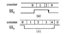 對(duì)從模式(MSTR=0),在沒(méi)有數(shù)據(jù)傳送的時(shí)候,SS高電平表示從器件未被選中,從器件不工作,MISO輸出高阻;在數(shù)據(jù)傳輸過(guò)程中,片選信號(hào)SS必須接低電平,且SS不允許跳變。如果SS從低電平跳到高電平,在SS的上跳沿,SPI模塊也將檢測(cè)到模式錯(cuò)誤,清空內(nèi)部計(jì)數(shù)器counter,并結(jié)束正在進(jìn)行的數(shù)據(jù)傳輸。直到SS恢復(fù)為低電平,重新使SPEN=1時(shí),才重新開(kāi)始工作,如圖6(b)所示。