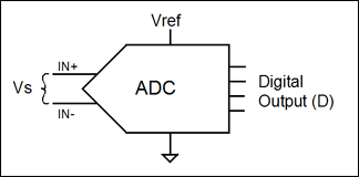 用于將傳感器信號(hào)數(shù)字化的ADC也是比例器件。無(wú)論其內(nèi)部架構(gòu)如何,所有ADC都是通過(guò)對(duì)未知輸入電壓與已知參考電壓相比較來(lái)工作的。轉(zhuǎn)換器的數(shù)字化輸出是輸入電壓與參考電壓的比值乘以ADC的滿量程讀數(shù)。考慮到內(nèi)部放大和設(shè)計(jì)的多樣性,還需要一個(gè)比例因子K。無(wú)論K值大小,只要ADC的配置未改變,K值都保持固定不變。公式4描述了一個(gè)普遍意義上的ADC (圖2)的數(shù)字讀數(shù)(D)和輸入信號(hào)(Vs),參考電壓(Vref),滿量程讀數(shù)(FS)以及比例因子(K)間的關(guān)系。