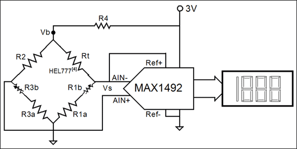 圖10. 在具有數(shù)字顯示的簡(jiǎn)單的溫度傳感器中,電橋電路除去0°時(shí)的多余信號(hào),使得ADC讀數(shù)等于溫度。