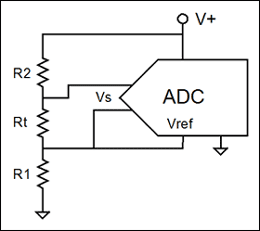 與之相似的采用電流驅(qū)動(dòng)傳感器和單元件阻性傳感器(如RTD)的技術(shù)已不常用了。這些電路中ADC的靈敏度會(huì)隨溫度或電源電壓的變化而變化。雖然如此,ADC和傳感器輸入的組合還是相當(dāng)穩(wěn)定的。