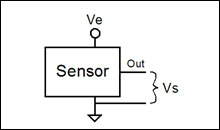 使用阻性元件的傳感器通常令一個(gè)電流流過(guò)電阻并測(cè)量其電壓。在輸出傳感器之前,可以將該電壓進(jìn)行放大或電平偏移,但是其大小仍然與流過(guò)電阻的電流相關(guān)。如果該電流來(lái)自于電源電壓,那么傳感器的輸出與電源電壓成比例。公式2描述了這類比例傳感器的輸出(圖1),其中Vs是輸出信號(hào),Ve是激勵(lì)電壓,S是傳感器的靈敏度,P是所測(cè)參數(shù)的量值,C是傳感器的失調(diào)量。