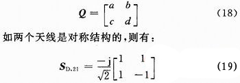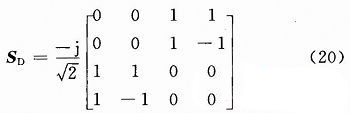 對于一個(gè)雙天線系統(tǒng),應(yīng)該有兩個(gè)正交模同時(shí)存在,去耦合網(wǎng)絡(luò)是一個(gè)四端口網(wǎng)絡(luò),正交輻射矩陣可以寫為:
