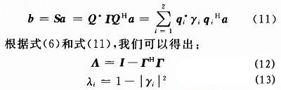 式中:A=diag{λ1,λ2},而Q是幺正的(即QQH=I)。根據(jù)厄米特矩陣的性質(zhì),兩個(gè)正交值λ1和λ2都是實(shí)數(shù),并且小于等于1。將式(5)代入式(4)得: